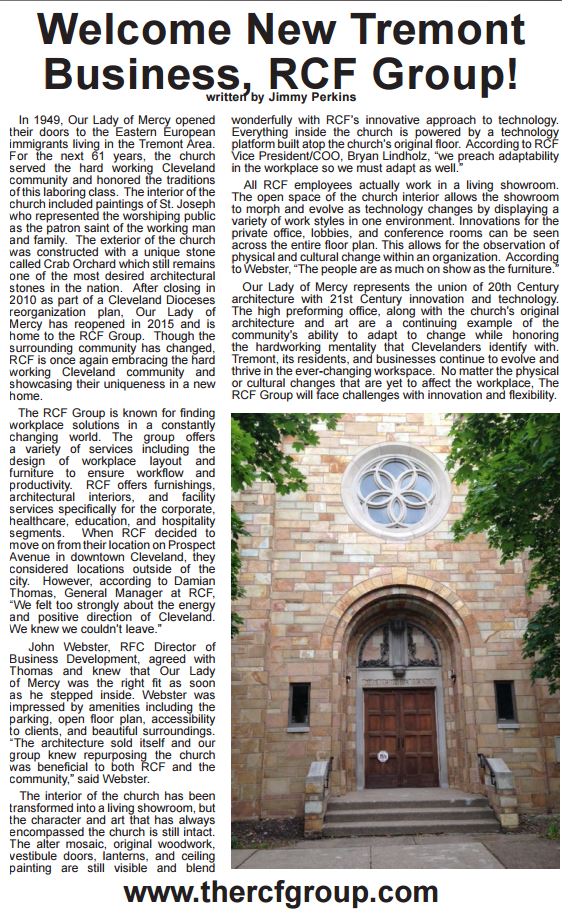 In May 2015 RCF Group moved from downtown Cleveland to the historic neighborhood of Tremont. There, they took residency in the former Our Lady of Mercy Church. RCF Group transformed the church into a living showroom.